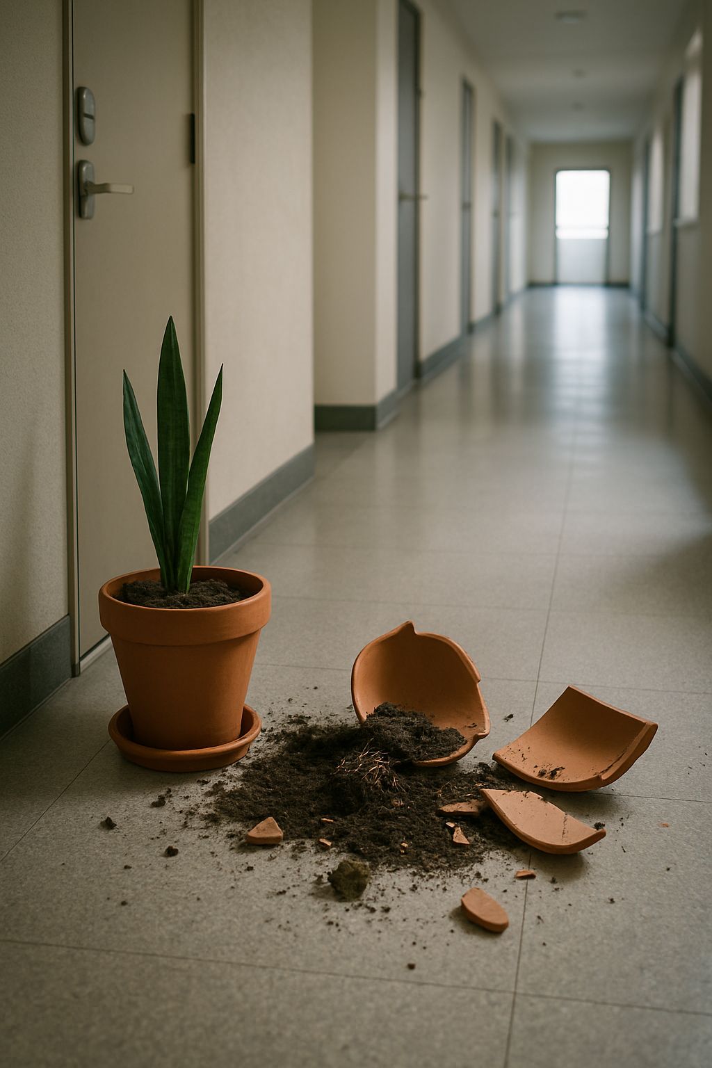 화분이 부서지긴 했지만 다행히 저나 다른 분들 모두 다치지는 않았고, 깨진 조각이 복도에 조금 흩어져 바로 빗자루로 치웠습니다.