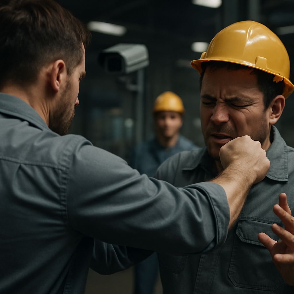 대규모 공장 내 시설 점검 중 협력업체 직원과 언쟁이 발생하였으며, 직원이 언어적 모욕에 이어 먼저 얼굴 부위를 주먹으로 때렸고, 이에 이용자님도 얼굴 부위를 주먹으로 한 차례 가격하였습니다. 사건 직후 보안실을 통해 경찰에 신고 및 출동이 이뤄졌고, 진술 및 CCTV 등 증거 제출과 사내 건강관리실의 응급 처치만 이루어졌습니다.