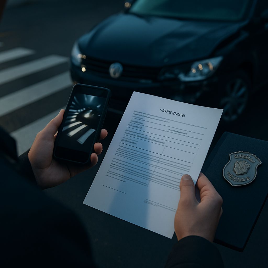 이용자님은 직장 근무 후 밤중에 식당에서 나오던 도중 횡단보도를 건너다가 흰색 BMW SUV 운전자의 우회전 차량에 밀려 다치셨으나, 차량 번호판이나 운전자를 특정할 수 있는 결정적 증거는 확보하지 못하신 상황입니다. 경찰에는 현장 사진 및 내용을 신고했으나 추가 수사는 진행되지 않았습니다.