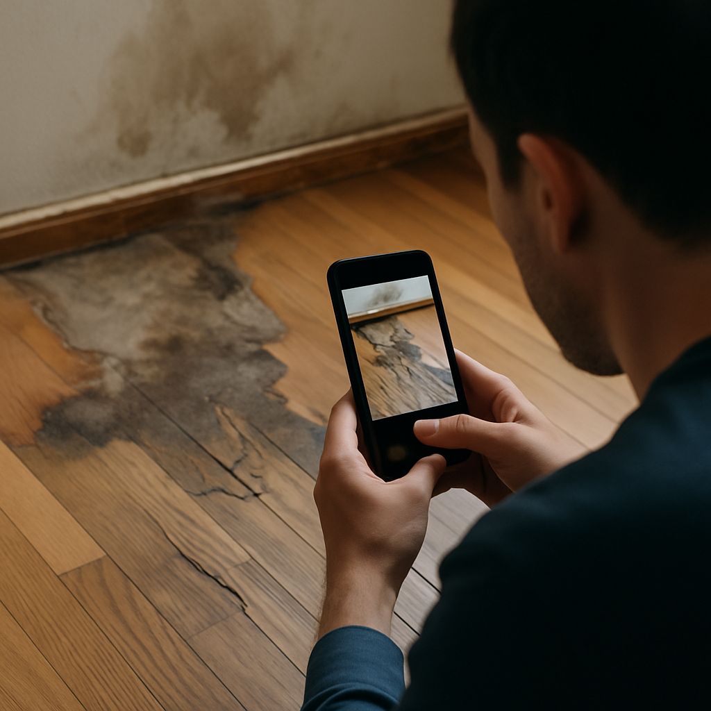 관리사무소에서 현장 확인 후 누수 위치를 점검했고, 저 역시 문제가 된 마루 부위 사진과 당시 습기 상태를 남겨두었습니다.