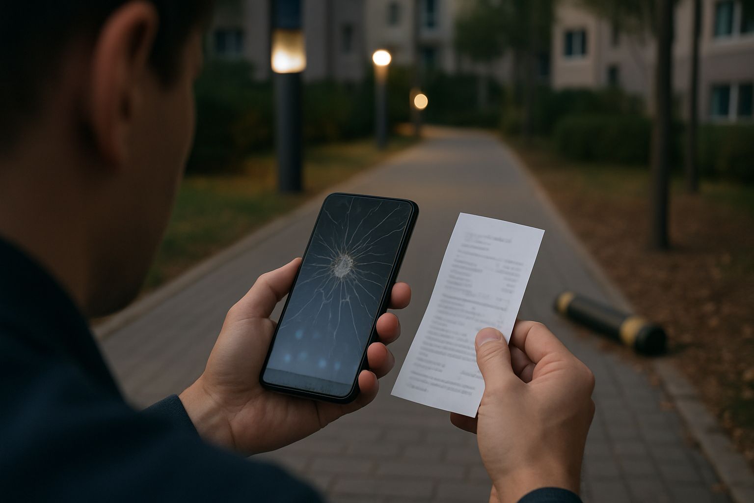 이용자님께서는 야간에 조명이 부족한 아파트 산책로에서 자동차 진입 방지 파이프에 걸려 넘어지며 휴대폰이 파손되고 신체 부위에 상해를 입은 상황입니다. 관리사무소에 사고사실을 전달했으나 뚜렷한 대응을 받지 못한 상태입니다.