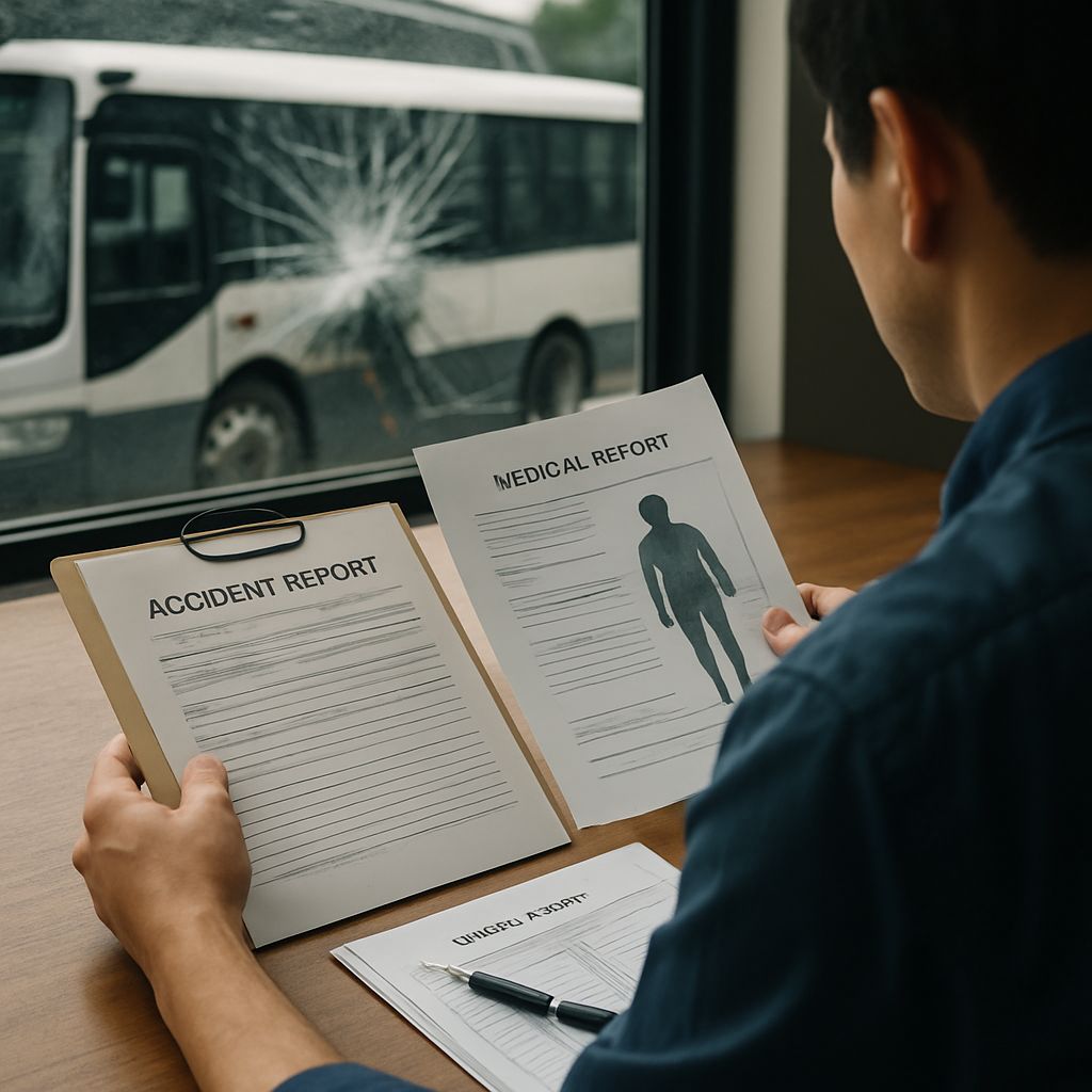 이용자님은 운송회사 출퇴근 시 회사 셔틀버스를 사용했고 해당 차량이 교차로에서 추돌 사고를 일으켜 부상을 입은 뒤 진단서 및 치료 관련 자료를 확보하고 있습니다