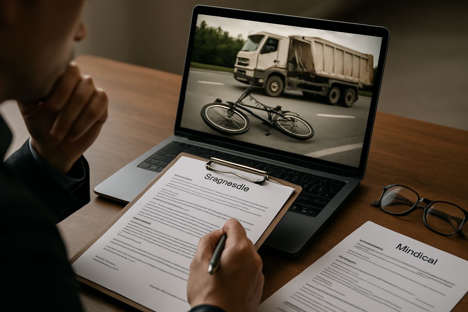이용자님은 동네 마트 인근 인도를 자전거로 주행 중 출입구에서 진입하던 대형 덤프트럭과 충돌하여 중상을 입었고, 실려간 병원에서 장기간 치료를 받았습니다. 사고 현장에서 경찰 조사가 있었으며 트럭은 종합보험에 가입된 상태였습니다.