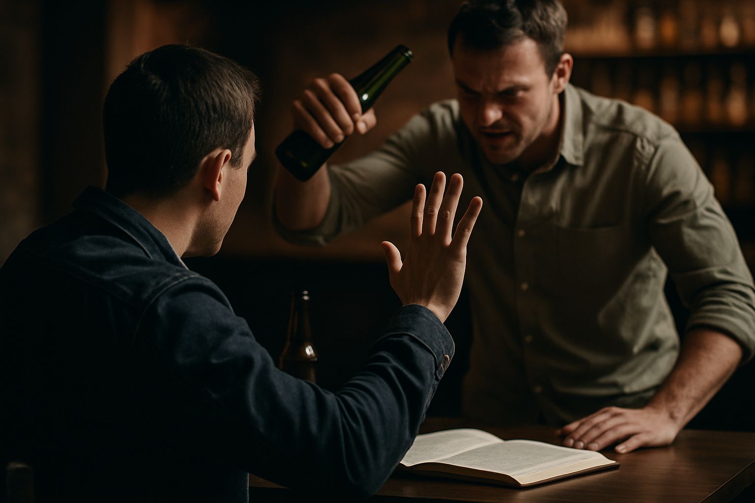 룸 형태 주점에서 지인과 언쟁 중 상대가 먼저 신체를 밀치고 폭행을 하여, 이용자님이 맥주병을 들어 상대 머리를 내리친 뒤 곧장 119에 신고한 상황입니다. 현장에는 CCTV와 목격자가 없었습니다.