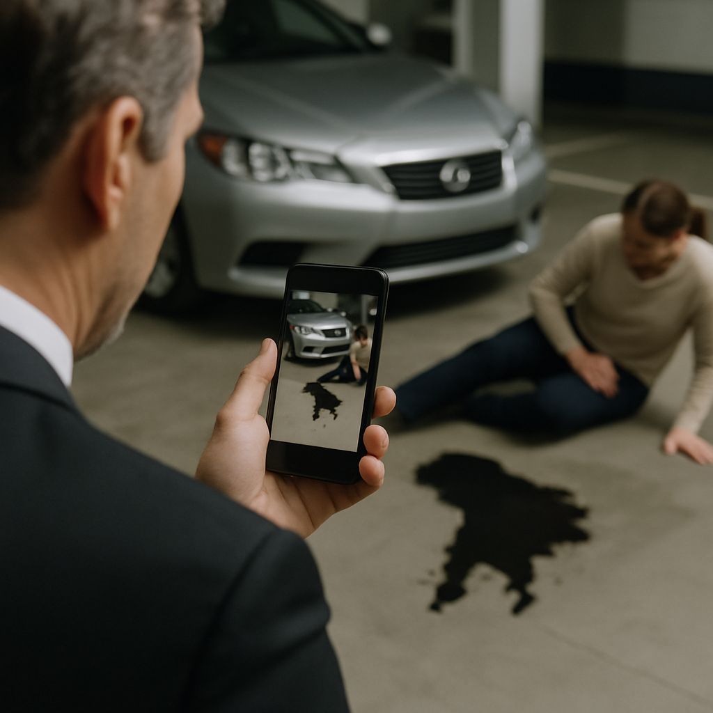 오일 자국이 바닥에 일부 번져 있던 날, 같은 동에 사는 이웃주민 박**님이 외출을 위해 본인 차량 쪽으로 이동하다가 그 오일 자리에 미끄러져 넘어지는 사고가 발생했습니다.