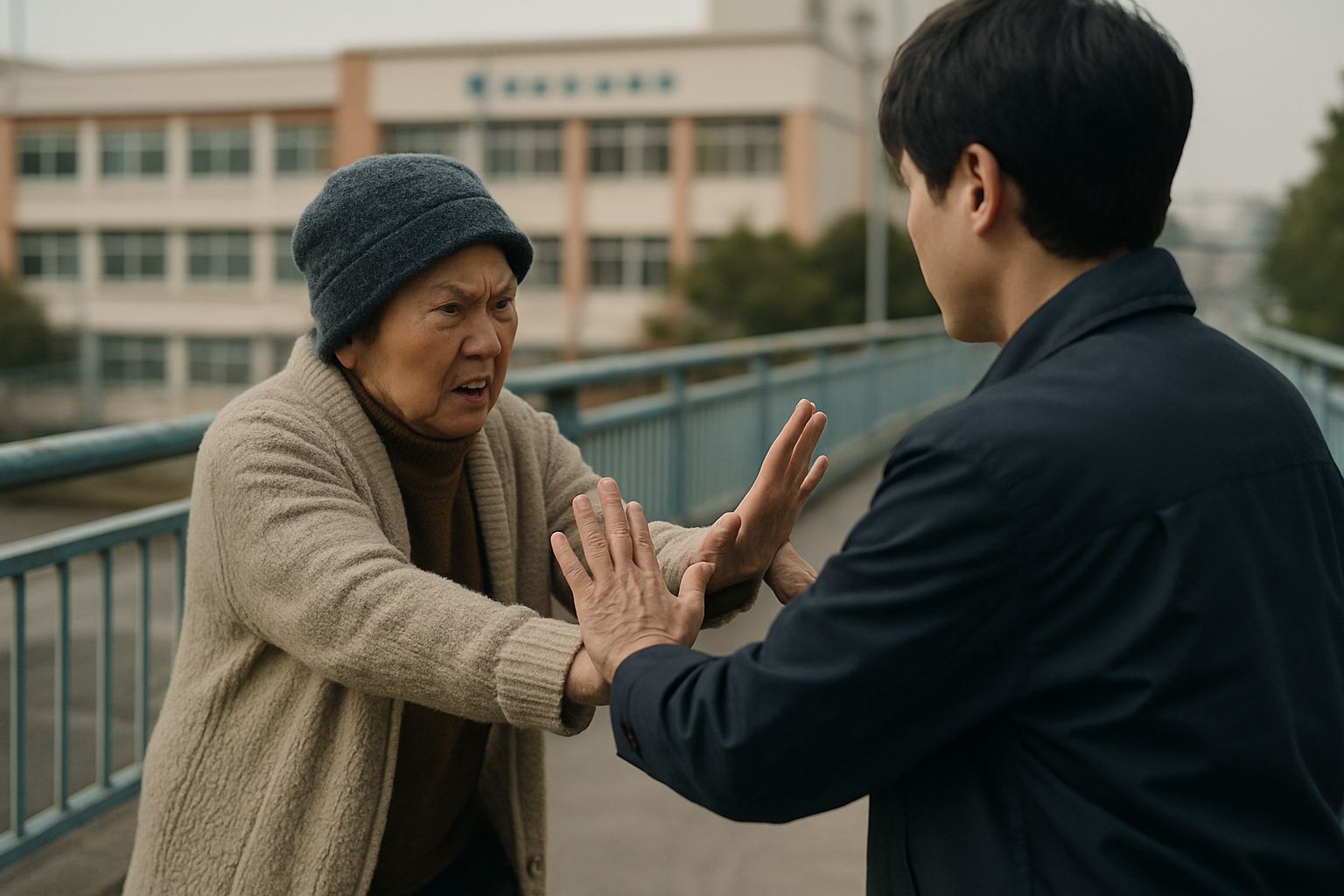 저는 순간적으로 겁이 나서, 가까이 오지 말라는 취지로 할머니의 어깨 쪽을 두 손으로 살짝 밀었고, 곧바로 할머니가 핸드폰으로 관리사무실에 연락하는 모습을 보았습니다.