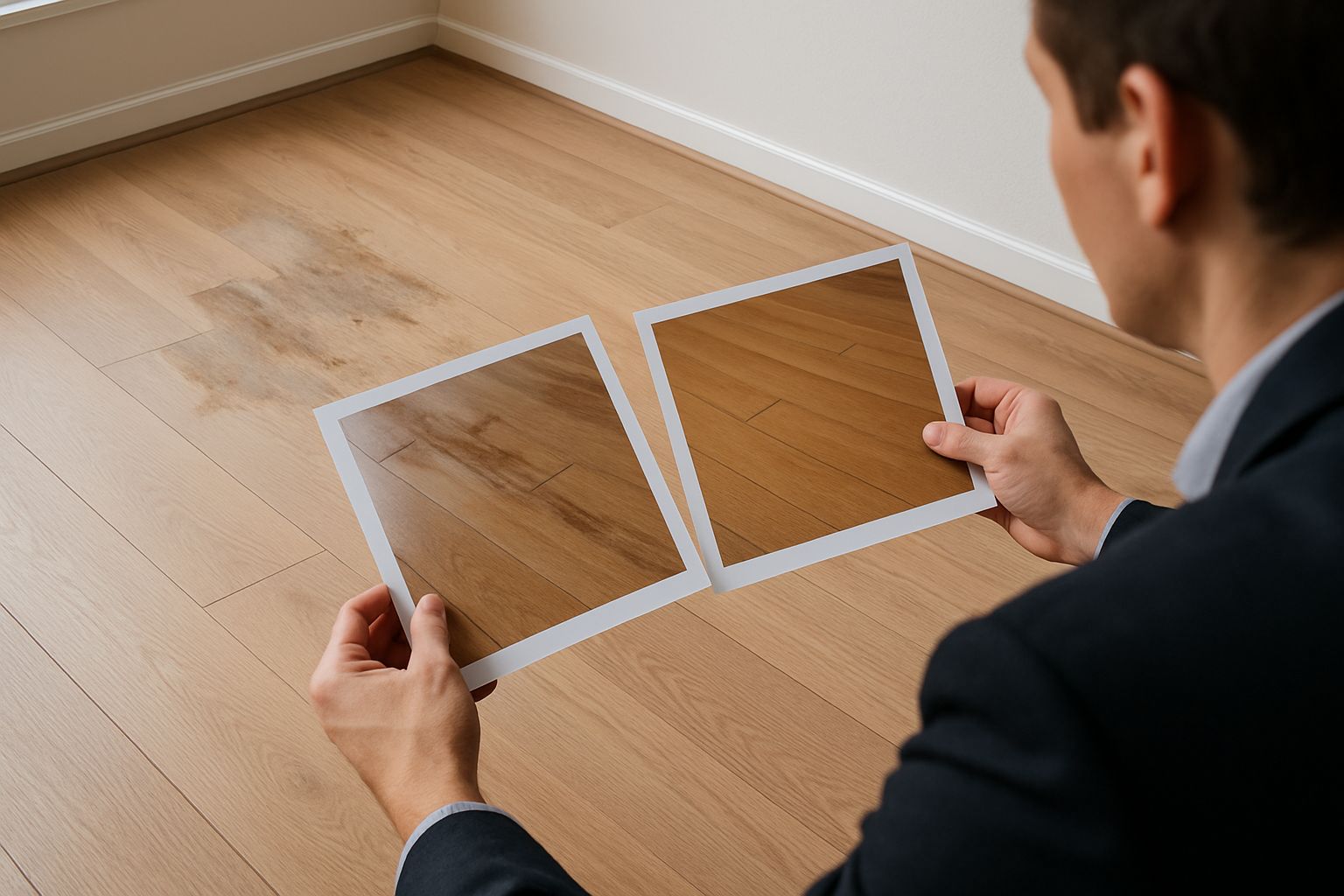 관리실 직원과 윗집 소유주가 함께 현장에 방문해 실내 강마루가 부분적으로 퉁퉁 붇고, 색이 변한 부분이 10조각 이상인 것을 직접 확인하고 바로 누수 유발 사실을 인정했습니다.
